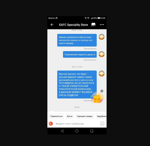 TC sdek just ah .. LA from arbitrary, 1 Time just Courier scored Bolt and put status not reach, 2 times at the PvZ hour stood in line after which I was told that there was no parcel, 3 times the same PvZ was deceived, if the Chinese understood then together sued the SDEC.