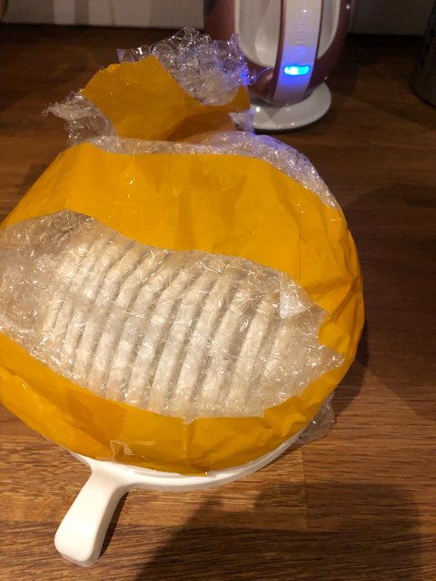 It came in time, fully tracked, packed in ordinary cellophane, from one side deformed.