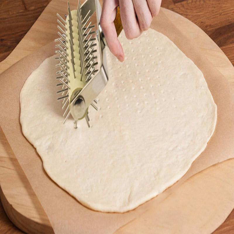Small, spiky rolling pins attached to a handle makes it easy to roll.