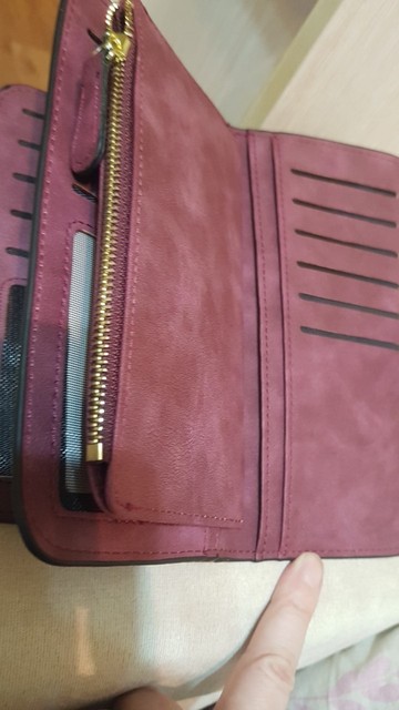 Delivery within 27 days. Purse without damage, smooth lines, neat. Nice to the touch. Has no pungent smell. Light Weight. Has 6 compartments for bills. Zipper is good. Button keeps excellent, closed with little effort. Seller recommend.